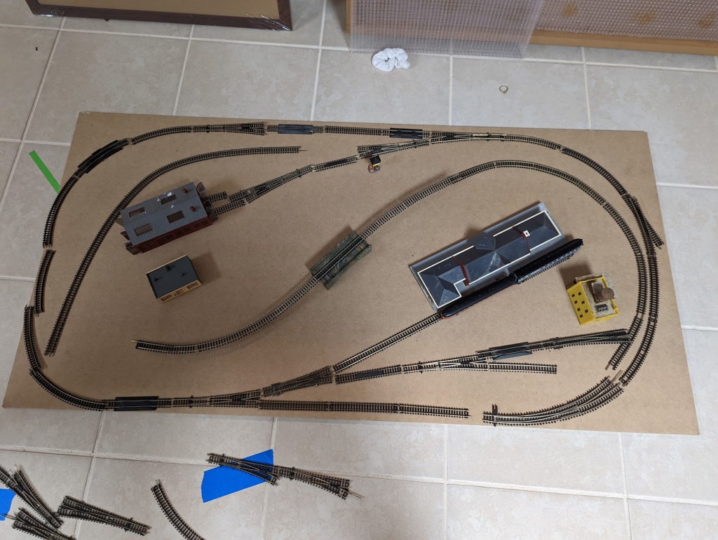 For this project I was originally thinking it would be about 2’x3′ due to the amount of material I possessed, but once the track was put down on the floor I realized 2’x4′ might work as well. I went to Home Depot to find the cheapest materials since this was more of a temporary layout than long term, and settled on particle board with a 1×2″ frame. This doesn’t give a lot of room underneath for wiring but it was fine for this purpose. With the board ready, I began placing track down to determine if my plans would fit in the area and see what it looked like.