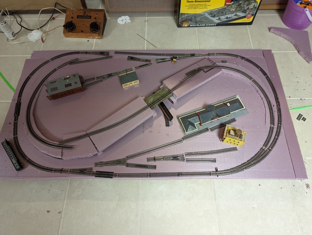 The astute viewer may have noticed below the track is now sitting on foam vs the particle board. At the time I was continuing to research modern techniques and practices, and quickly realized foam was widely used across different scales and layout sizes. Knowing this would give many more chances to practice newer scenery ideas, I headed back to Home Depot and picked up a sheet of 1″ foam board.